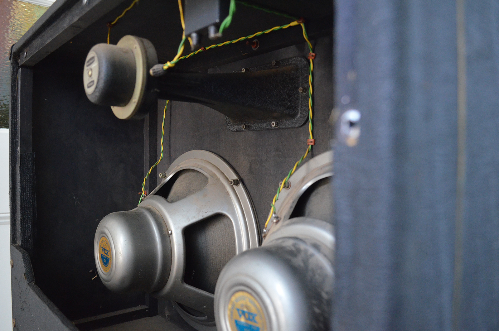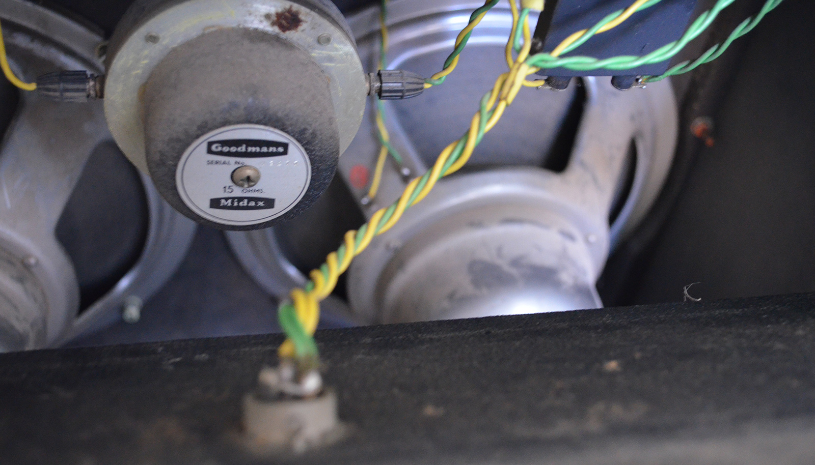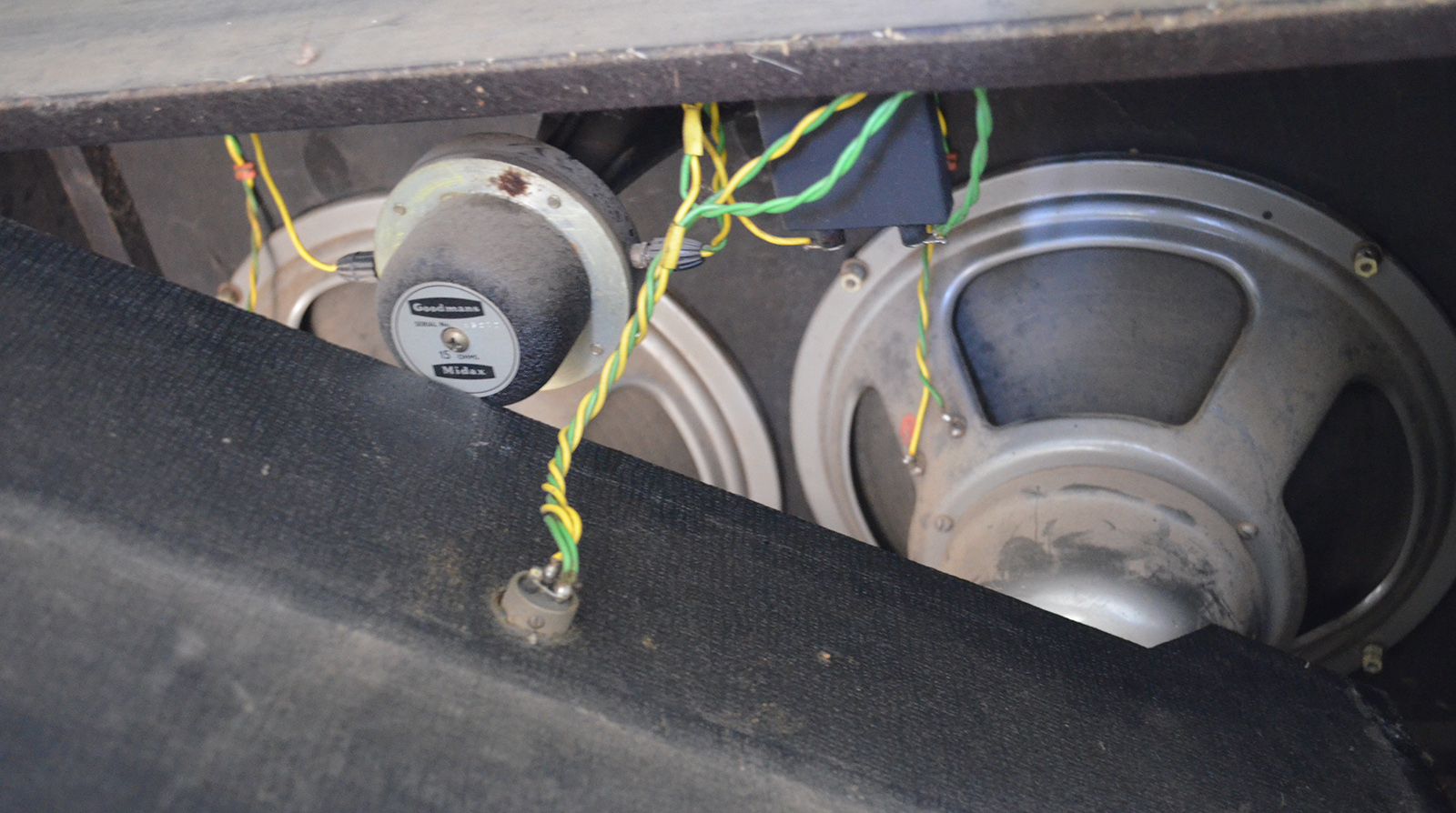 An AC100 speaker cab from 1965 - completely unchanged. Original Celestion T1088 silver alnico speakers, Goodmans Midax horns, wiring loom, and Cannon XLR connector in place. One swivel mount remains.
