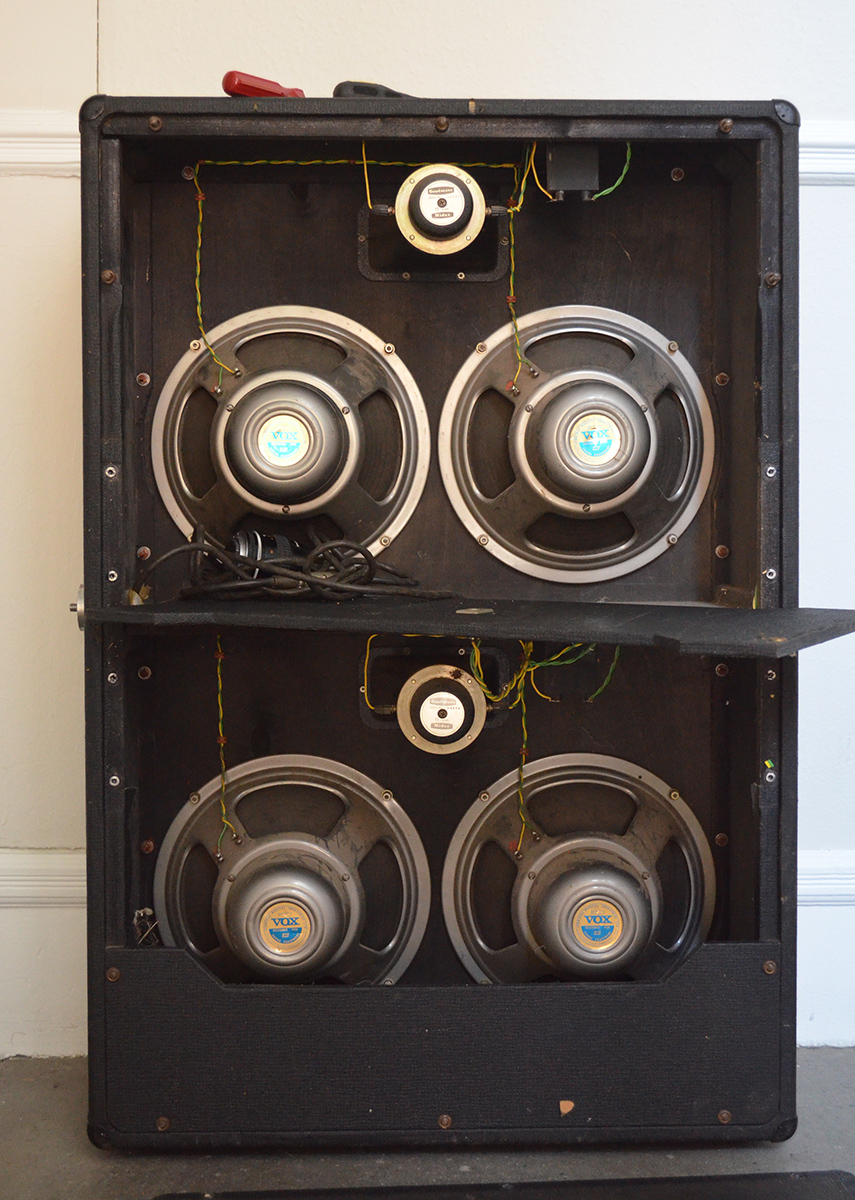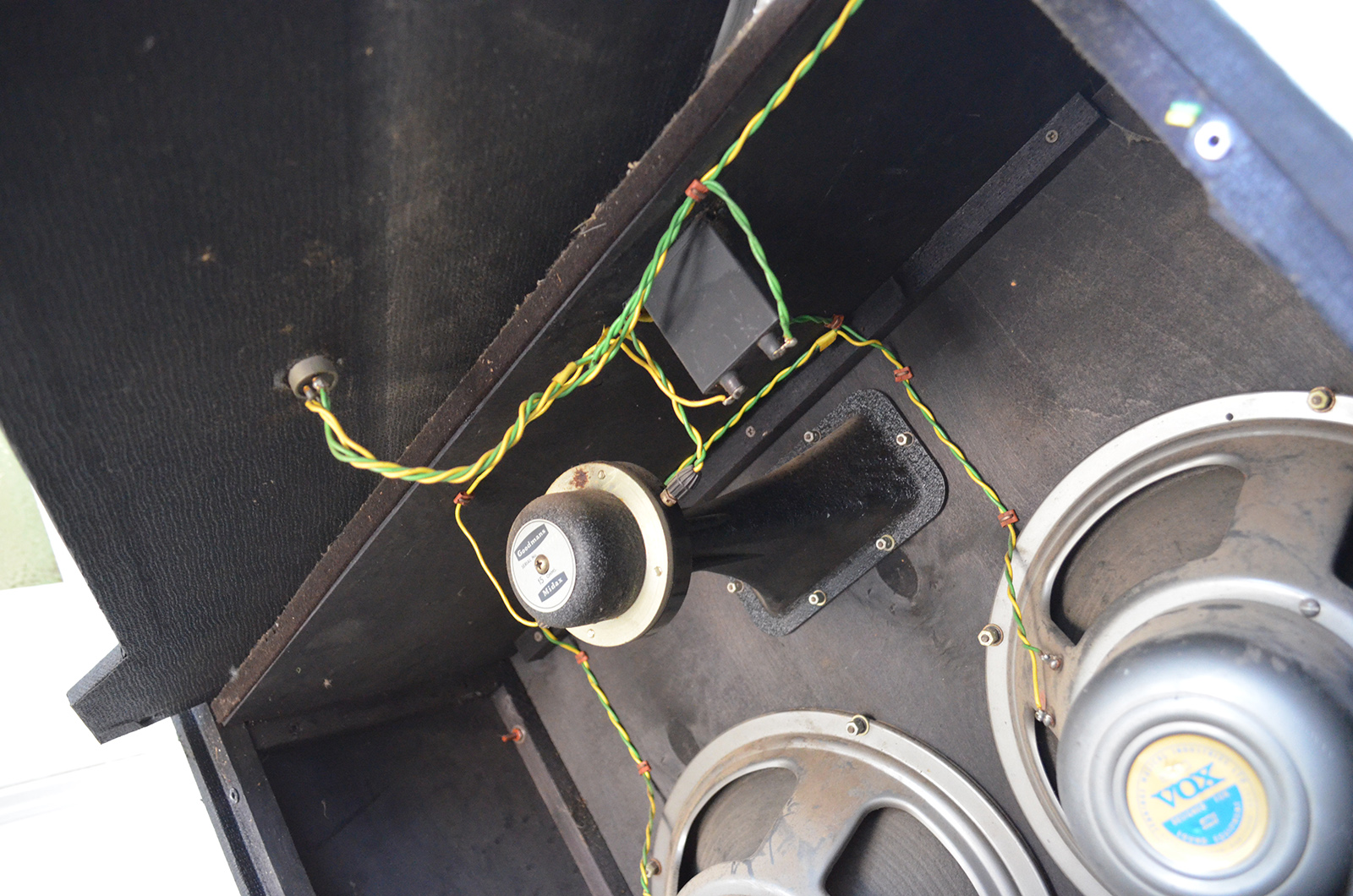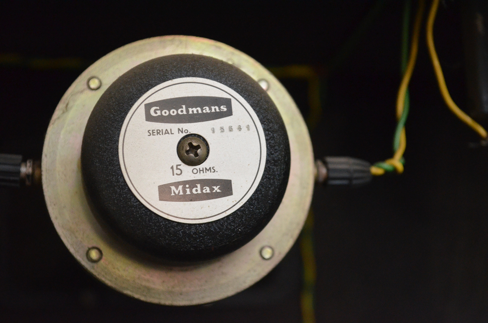 An AC100 speaker cab from 1965 - completely unchanged. Original Celestion T1088 silver alnico speakers, Goodmans Midax horns, wiring loom, and Cannon XLR connector in place. One swivel mount remains.