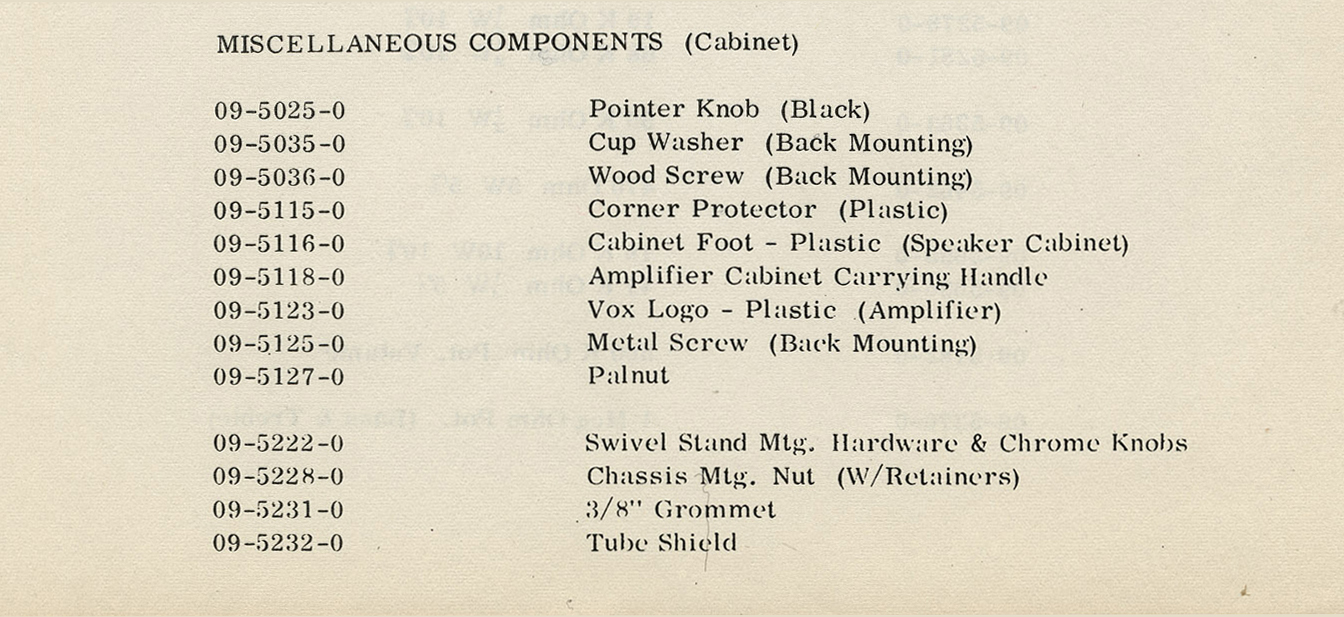Below, details from the section on the AC100 in the service manual compiled by Thomas Organ in late 1966 / early 1967. There were two main service centres in the USA: one at Sepulveda (California), the other in Evanston (Illinois). Parts were flown over from England by JMI. Everything was available - from cup washers to individual back panel boards.