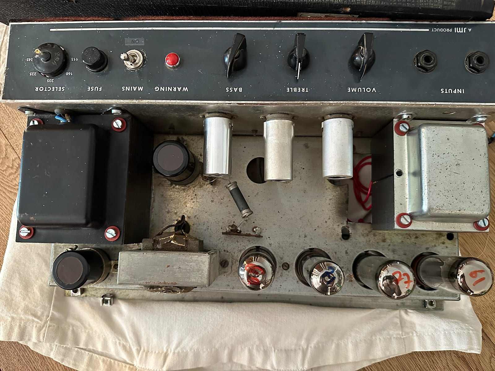 Chassis number 02142. The speaker cabinet is from early 1968 or later, as can be seen by the solid state style logo and the Goodmans Audiom 81s with special Goodmans labels (for JMI). Similar labels can be found on certain Goodmans !8" drivers in Foundation Bass cabs sold by "Vox Sound Equipment Limited" (which took over unsold JMI stock in mid '68). No visible date codes on components in the amplifier section.