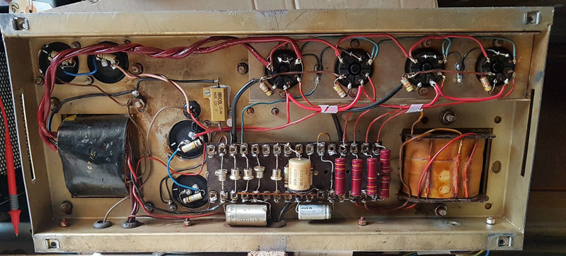 Above, a couple of newer pictures of the chassis, prepared at factory for pairs of main filter capacitors. The output transformer has subsequently been replaced or at least re-oriented. The Woden choke (original) with the date code "LX" = November 1966 for its manufacture.