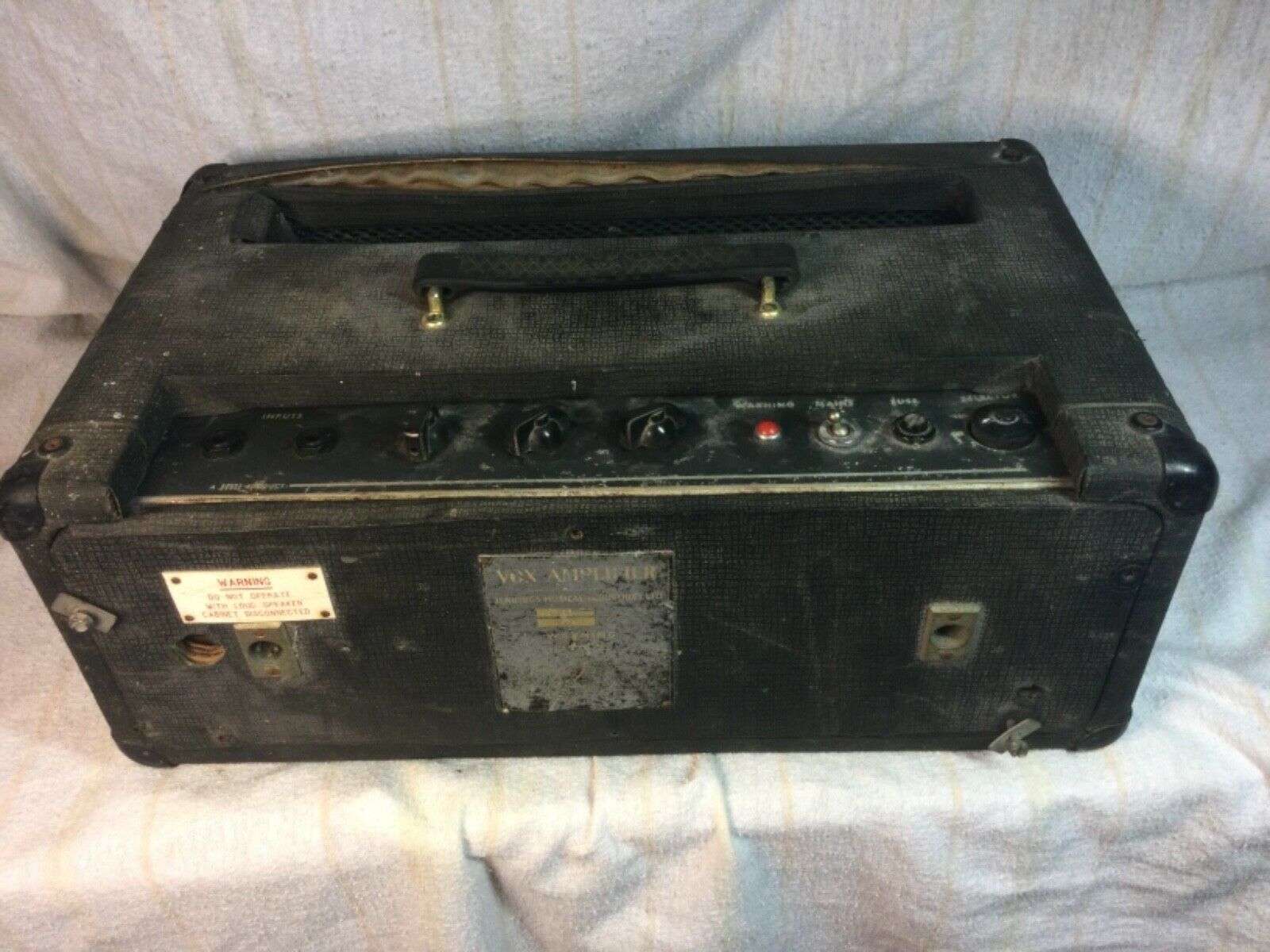 Chassis no. 1020. A single owner amp, purchased new in Oklahoma City along with a second AC100 for use in the band "The Concepts". Aside from one minor addition in the preamp, all original. Only the valves and casters have been replaced (the original valves still exist). Note that "92" is chalked on the inside of the box and the back board. The speakers are dated May 1965. The second AC100 was sold in 1967. Thanks to Dave for the details and pictures.