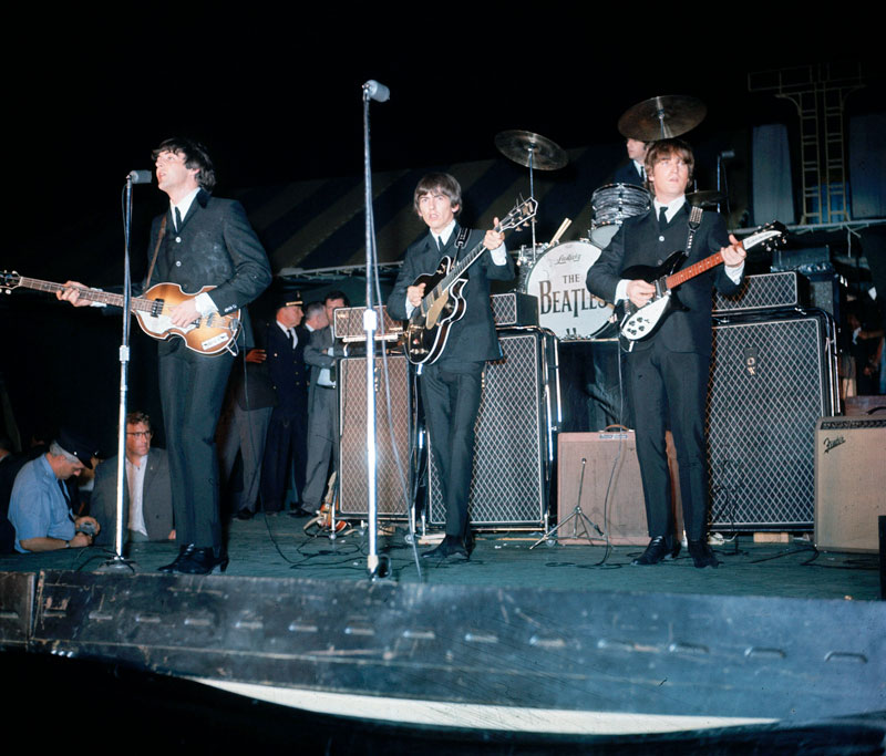 Forest Hills (28th August 1964): Paul with his brown-fronted bass set, and John and Paul with all-black AC80/100s and Super Deluxe cabinets.