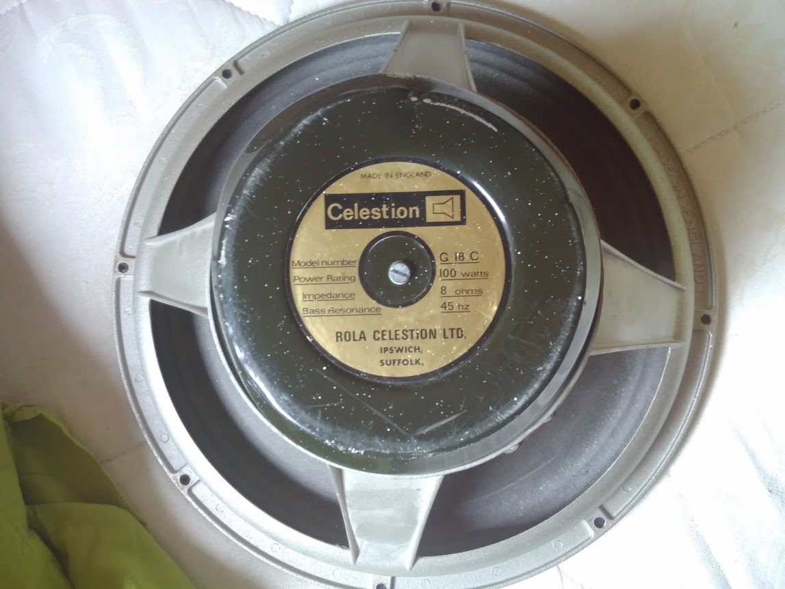 One version of the G18C, pretty much identical in build to the speakers sprayed grey for Vox in the late 1960s, was designated a T1200 by Celestion. Below, one at home in a Marshall bass cab: