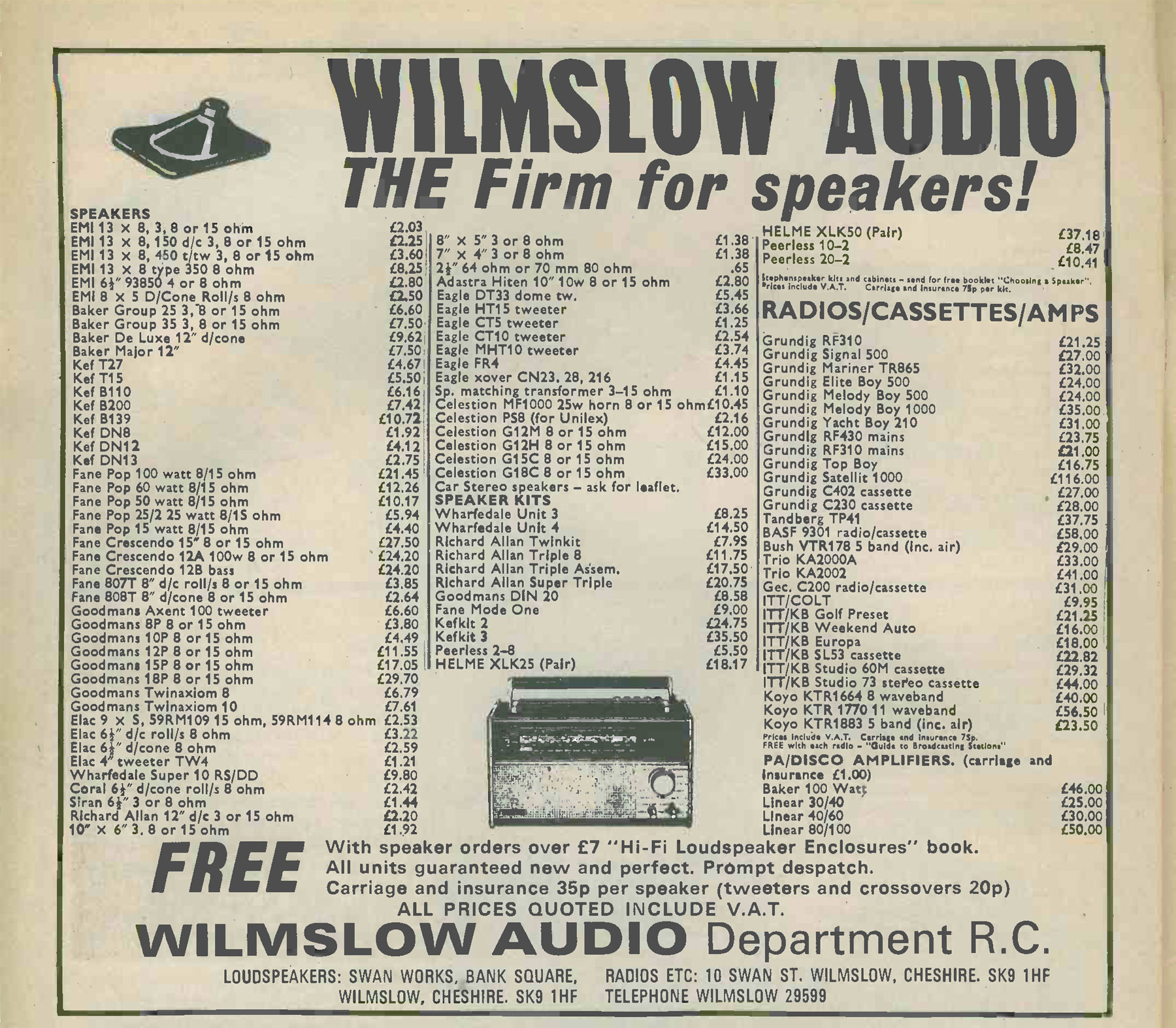 Advert placed by Wilmslow Audio in "Radio Constructor" magazine, December 1973. The G18C available in 8ohm and 15ohm versions, price £33 - in today's money, around £320.