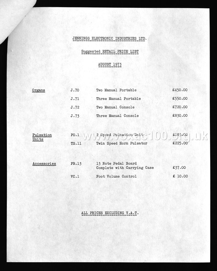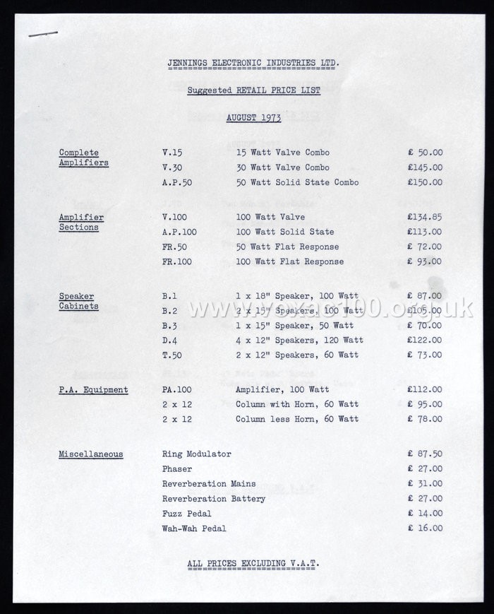 The catalogue to which this pricelist relates is available in its entirety here. The new range of "purple" amps encompassed - and the new square format JEI logo - was made ready for launch at the "Associated Musical Instrument Industries" Trade Fair at the Russell Hotel, London, in August 1973.