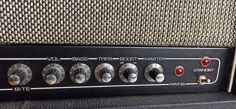 100 watt output. Two channels: bass and lead. The lead channel has volume, bass, mid, treble, and "bite" (preamp distortion) controls. The bass channel: volume, bass, treble, and boost. A master volume is provided far right. Four ECC83s serve the preamp, four EL34s in the power section.