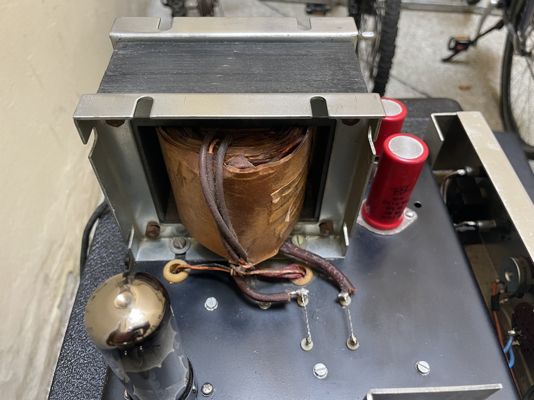 In superb original condition. The red CCL filter capacitors bear the date code "D71" = April 1971 for their manufacture. The valves are ERA-branded EL34A, the ECC83 made in GDR. One of a group of amps not fitted with a logo or serial number plate. Inside the wooden case, the name "Eleanor", likely to be one of the ladies responsible for "finishing" - adding the grille cloth, piping, and so on. Thanks to Angel for the pictures.