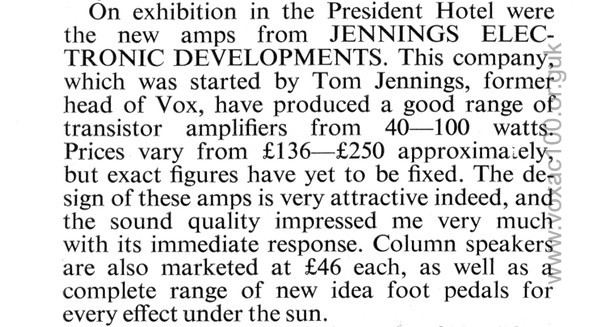 Detail from Derek Underdown's copy of the Jennings Electronic Developments brochure of early 1969 (certainly in existence by the time of the Frankfurt Trade Fair). Thanks to Toni Standing, Derek's daughter.
