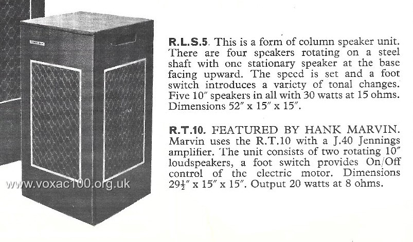 The Jennings version of the Leslie and Vox Gyrotone rotating speaker units, complete with an on/off footswitch and cover. For an overview of history and design, see this page.