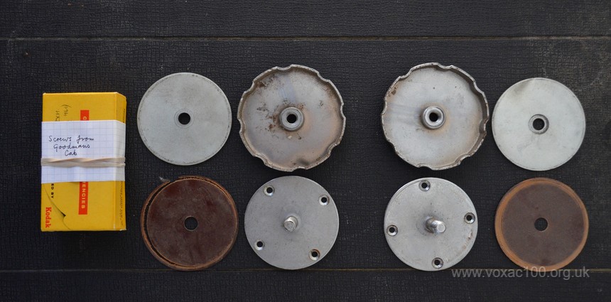 On the left below, a standard JMI hand-wheel (as used from mid 1964 through to early 1968); on the right, a battle-scarred example of the Thomas Organ version. JMI impressed the logo into the metal; Thomas Organ incised it.