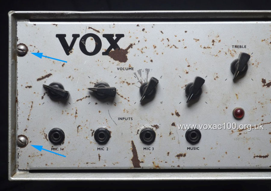 A detail of one of the two flat-fronted MC100/4s from 1965 currently known. The screws fixing the preamp and power amp assemblies to the box are mushroom head 2BA, 3/8" long - just long enough to fix securely into the cage nuts in the frame of the box and no more. Mushroom head 2BA x 3/8" were also used on the slope-fronted metal-clad amplifiers, and on the MC50/6 and MC100/6. The early MC100/6 pictured in previous entries retains one original.