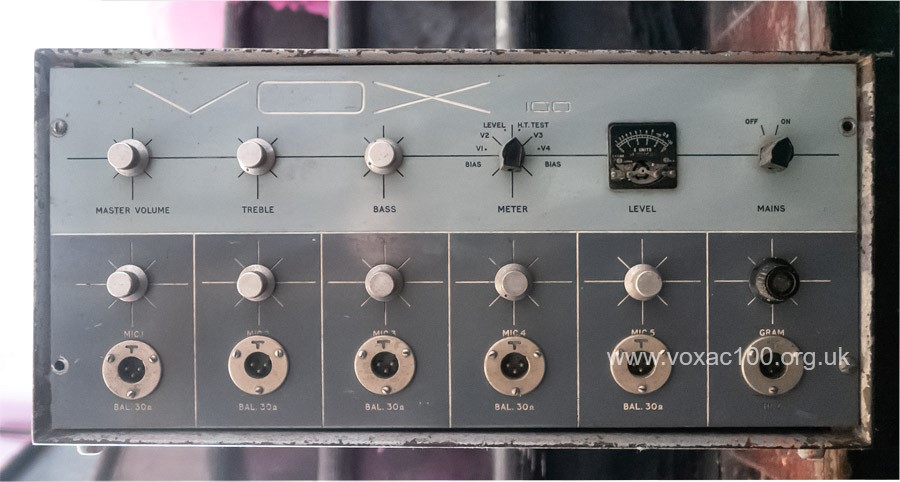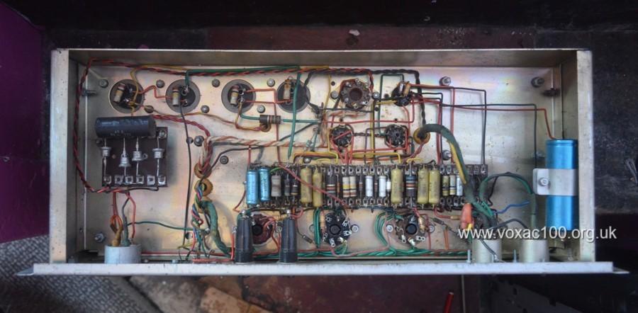 Thanks to Steve, some pics of a first generation Vox MC100/6 assembled for JMI by Triumph Electronics in mid 1965 - the lone survivor from a set of four ordered by a TV Studio in the UK for its live shows. For the time being, a general view of front and power section, the format of the latter much as those of the MC100/6s of 1966 and 1967.