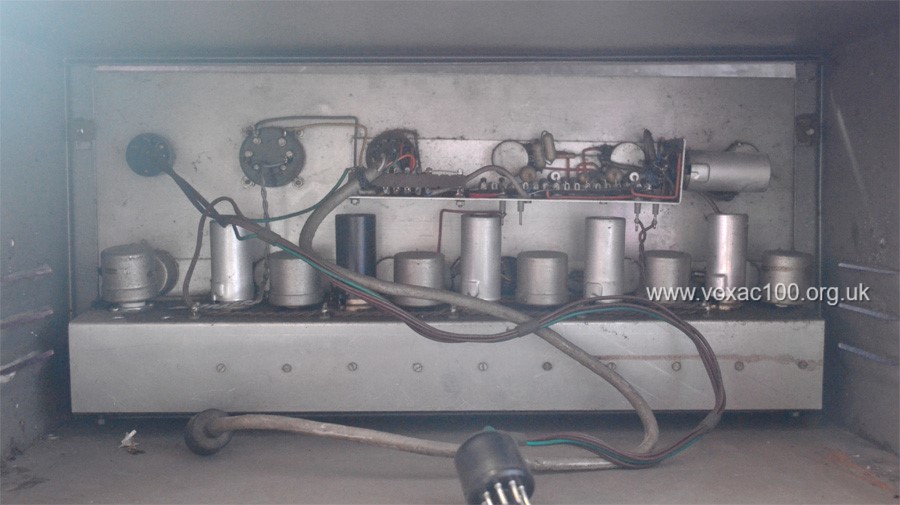 AC100 serial number 1944, chassis produced by Triumph Electronics under contract for JMI. Further pictures can be found on this page. The grille cloth was evidently replaced some time ago. General condition of the amp and cabinet is good. The paired-up filter capacitors on the upper chassis are a later adjustment, two new cans added to the existing two (in line with OS/167). The back panel has square rather than rounded corners.