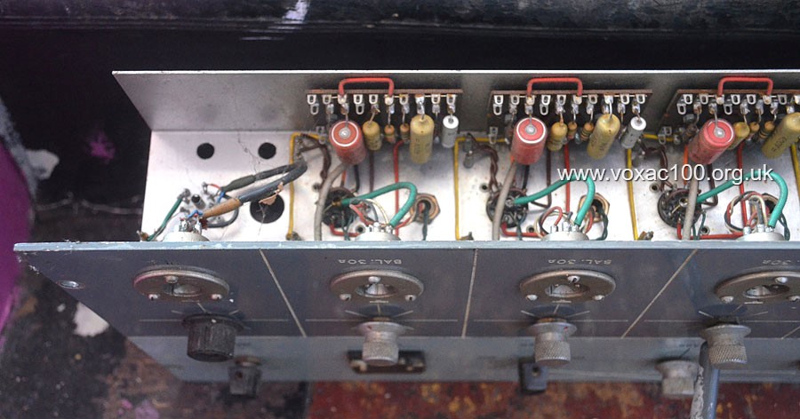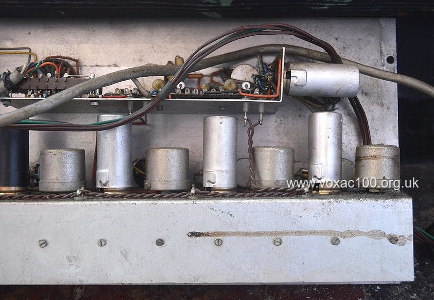Thanks to Martin, pictures of a late grey panel AC80/100, serial number in the 400s, mid 1965, have been assembled here. The amp was owned by Robert Valentine, who worked for JMI from 1959 to 1964, and repaired by Alan Pyne, also of JMI (c. 1959 to 1968). The greatest number of AC80/100s in 1965 (serial numbers in the 300s and 400s) went for export - principally to the USA and Europe - but some were evidently retained for the home market (as one would expect).