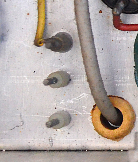 The right hand side of the preamp assembly showing the impedance matching transformers, the ECC83 valves in their cans; and the fixing screws for the boards underchassis. Typical of Triumph practice, the insulated chassis pass-throughs - effectively junction solder points taking signals or voltages from one level to another.