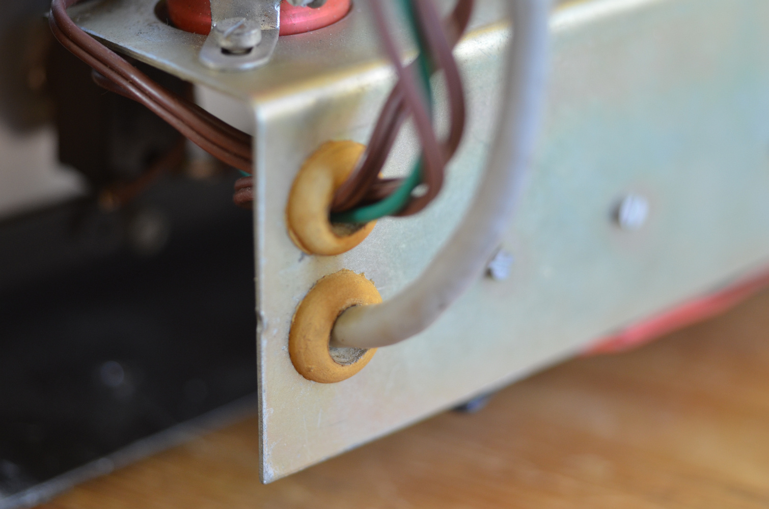 Some details of the preamp of an all-valve Vox 100 watt made by Triumph Electronics in 1966. General pictures of the amp are on the main 100 watt PA page. Typical of Triumph, among other things, are the orange grommets for the chassis pass-through holes; rivets rather than screws to fix the preamp sockets (as for early AC50s); and the use of red R.T.C. (Reliance Telegraph Company) capacitors.
