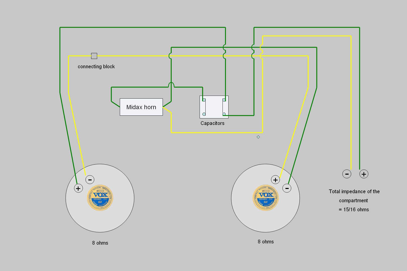 Below, the schema of the upper compartment of an AC100 SDL speaker cabinet (with basket top trolley) from early 1965 - second generation. Total impedance 15/16 ohms. The lower compartment is arranged similarly. The two were wired in parallel at the input socket, resulting in a total impedance of 8 ohms for the cabinet as a whole.