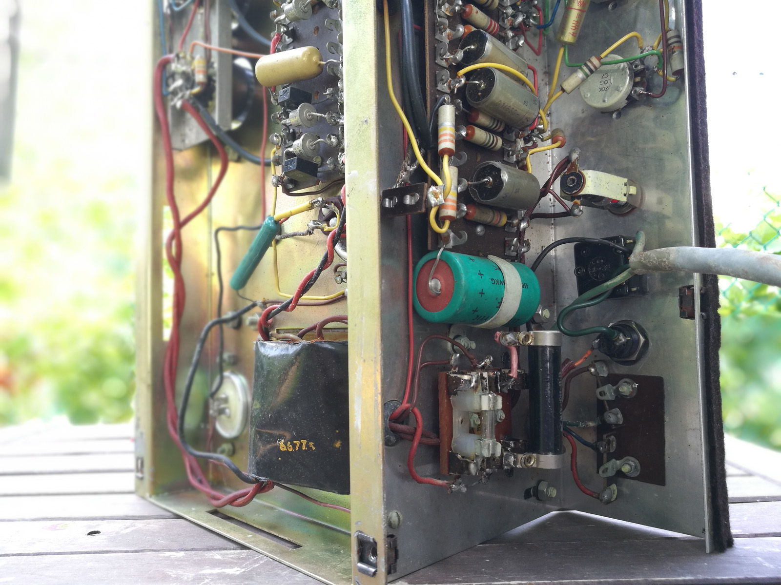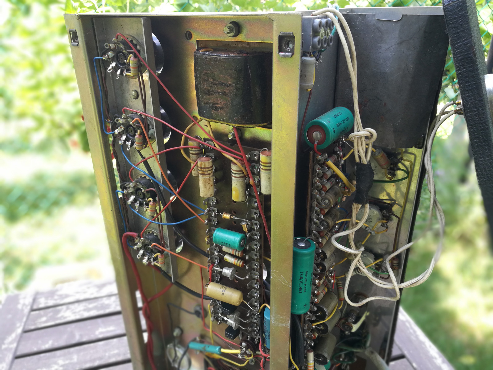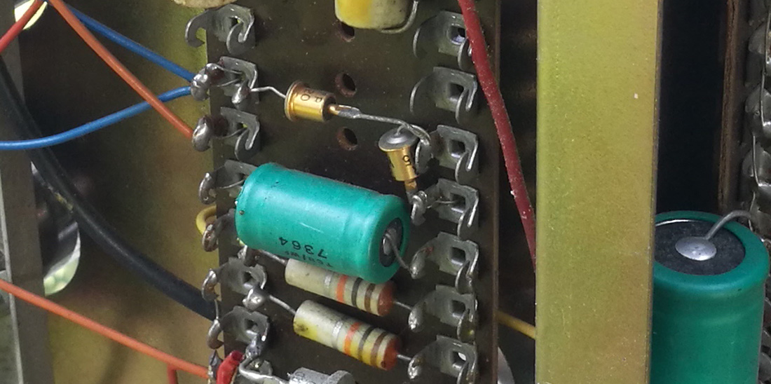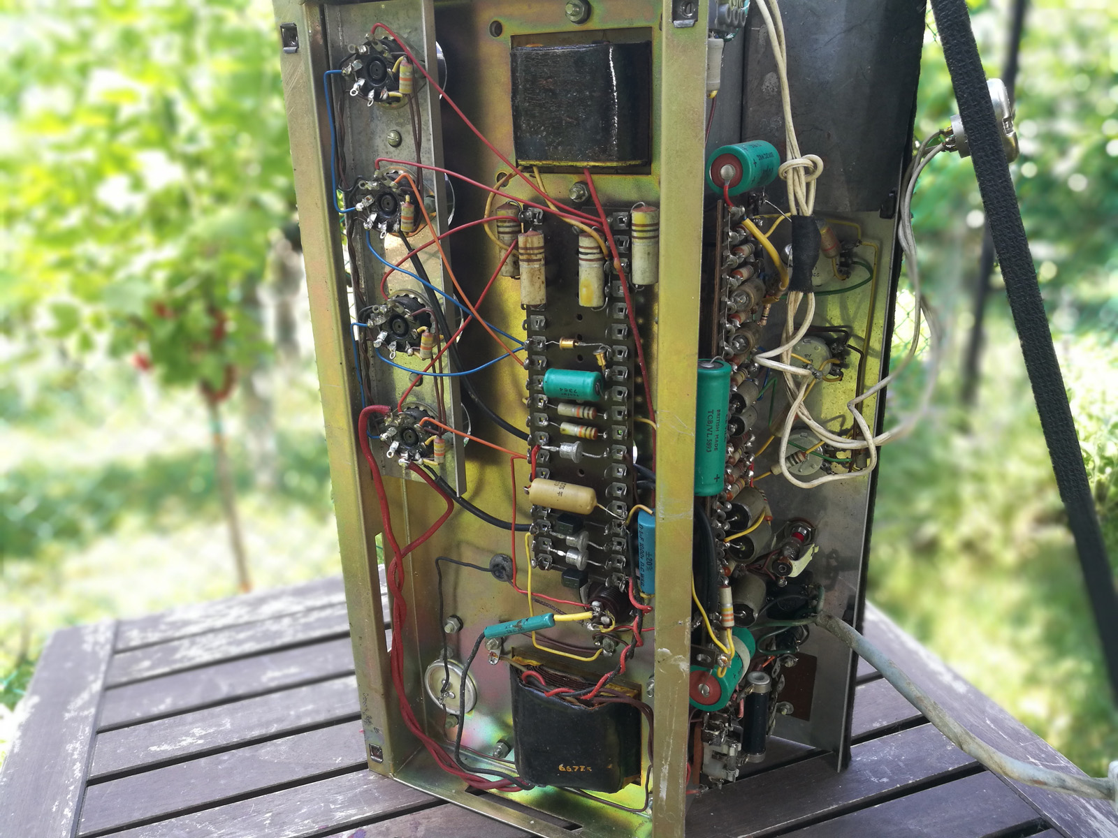 AC100 serial number 682, conforming to the "100W Amplifier" schematic. A few changes here and there but all reversible. The amp still has its original yellow-print Mullard XF3 EL34s - date codes B5Ex = Blackburn Factory, May 1965, the last digit, which gives the week, illegible.