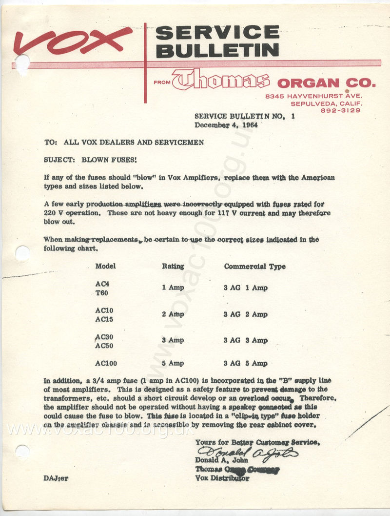 AC100 (fixed bias) parts list - issued by Thomas Organ