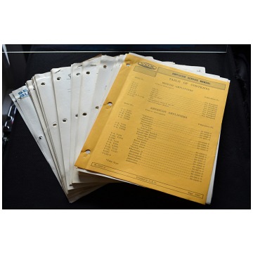 The sheets below come from the service manual pictured above, issued by Thomas Organ in September 1967. Besides the AC100, the other British-made amps encompassed are: the AC4, AC10, AC15, AC30 (two versions), T60, and AC50 (three versions). All the American amps are represented. There are wonderful exploded views of connectors and so on, on some of the fold-out pages.