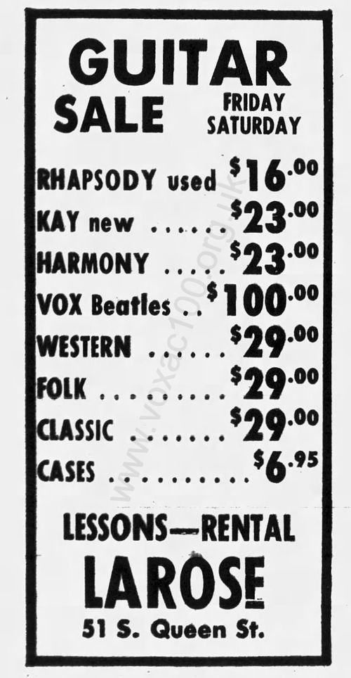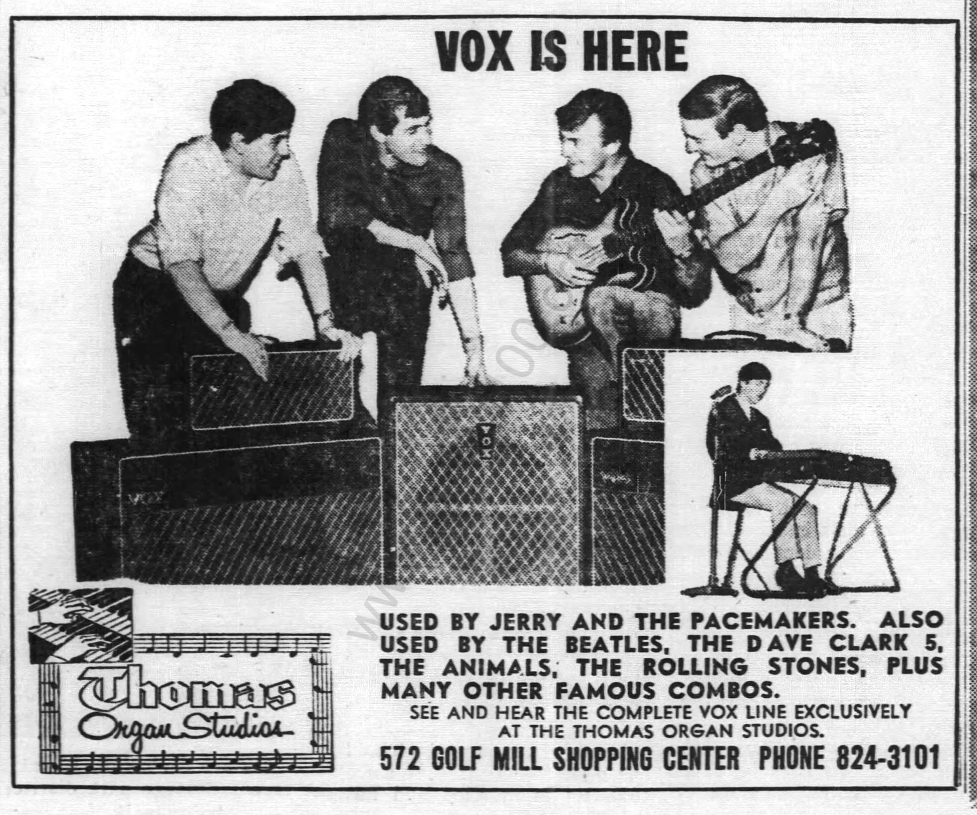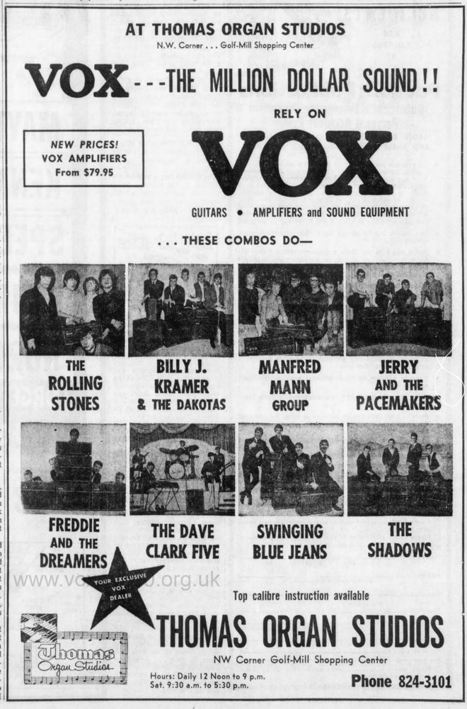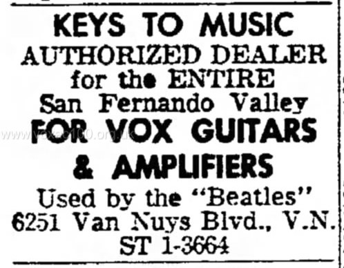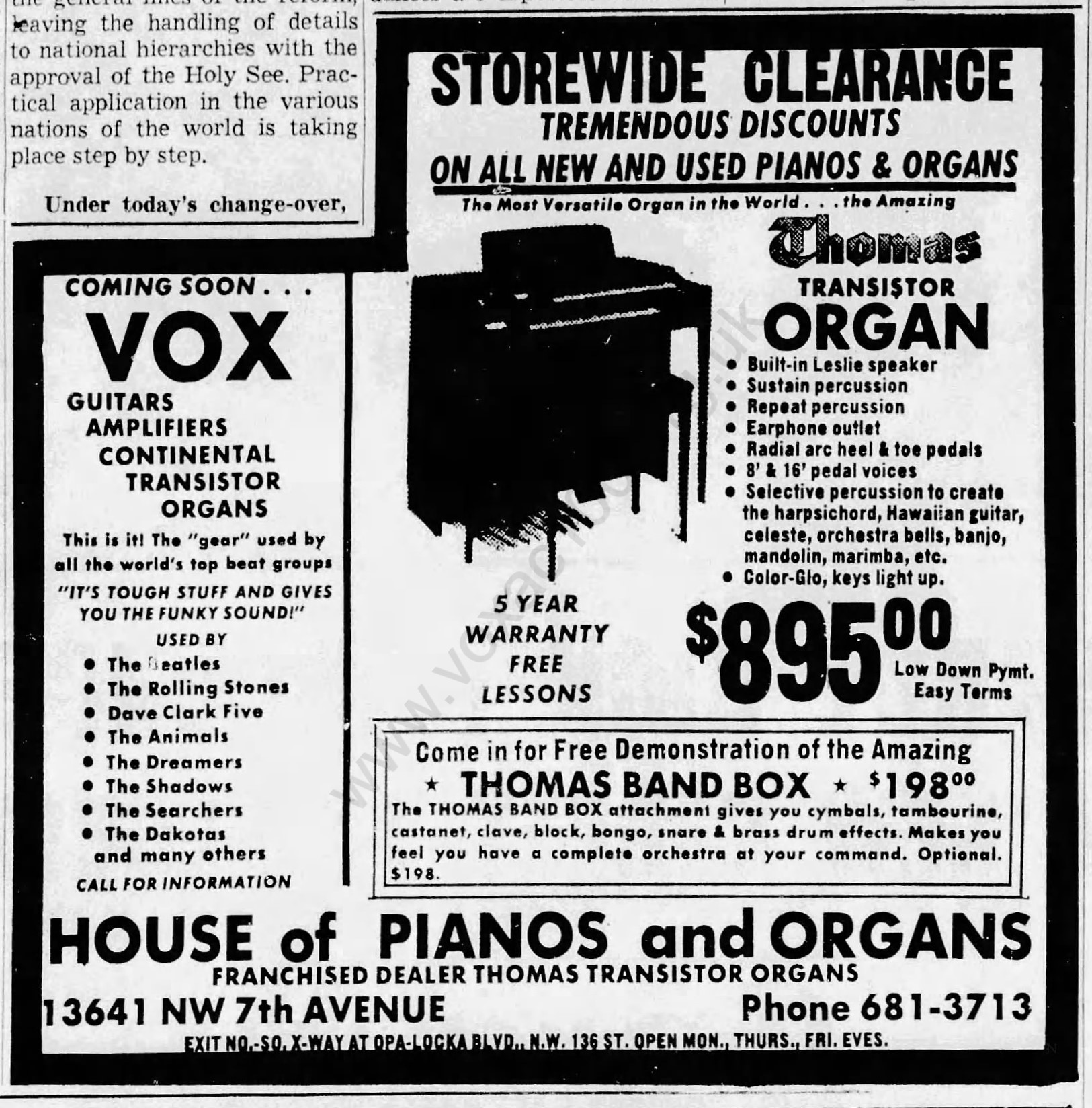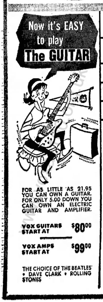 Adverts that are repeated from week to week are generally omitted from the sequence below. Often in these relatively early adverts there is a merely a simple mention of Vox guitars or amplifiers being available.