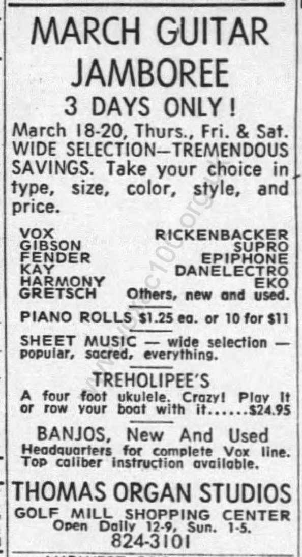 "Chicago Tribune", 7th March. Thomas Organ Studios, Golf Mills Shopping Center.