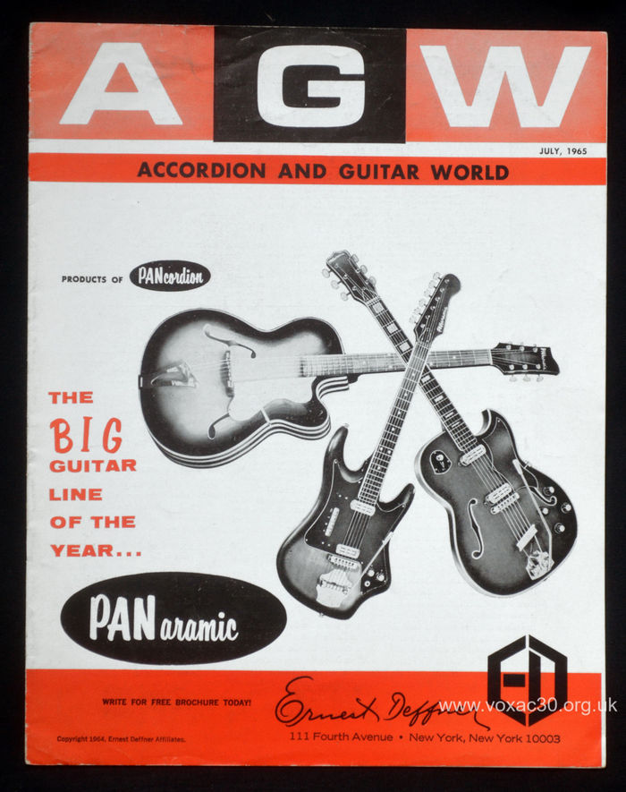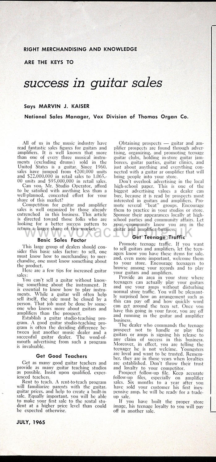 >A piece by Marv Kaiser, National Sales Manager of the Thomas Organ Vox Division, on the business of selling guitars - "Accordion and Guitar World", July 1965.