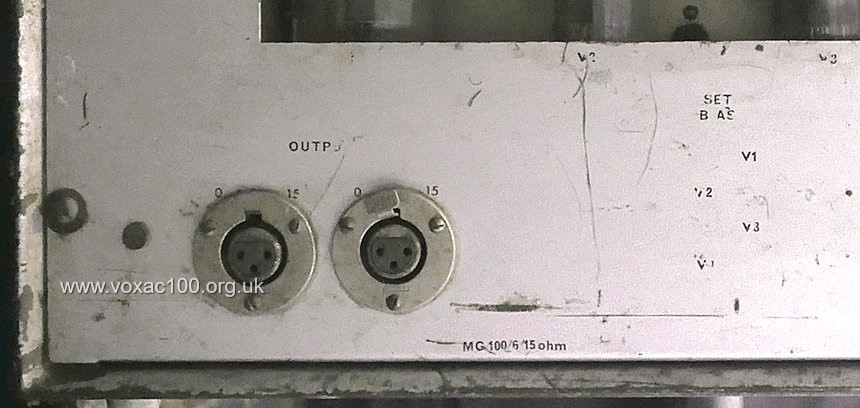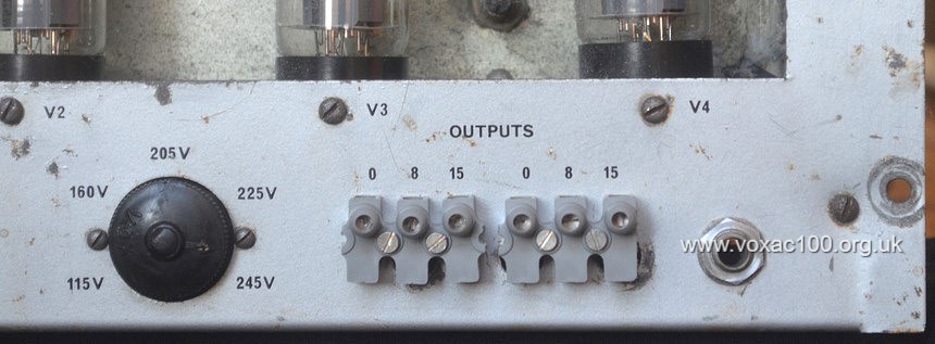 The original speaker connectors were Belling Lee L1469 terminal blocks, used on most Vox PA amplifiers through to the end of 1965. One can just see the legends for the various taps - "0 - 8 - 15" above the sockets. Further below, blocks reinstated in an MC100/4 from mid 1965.