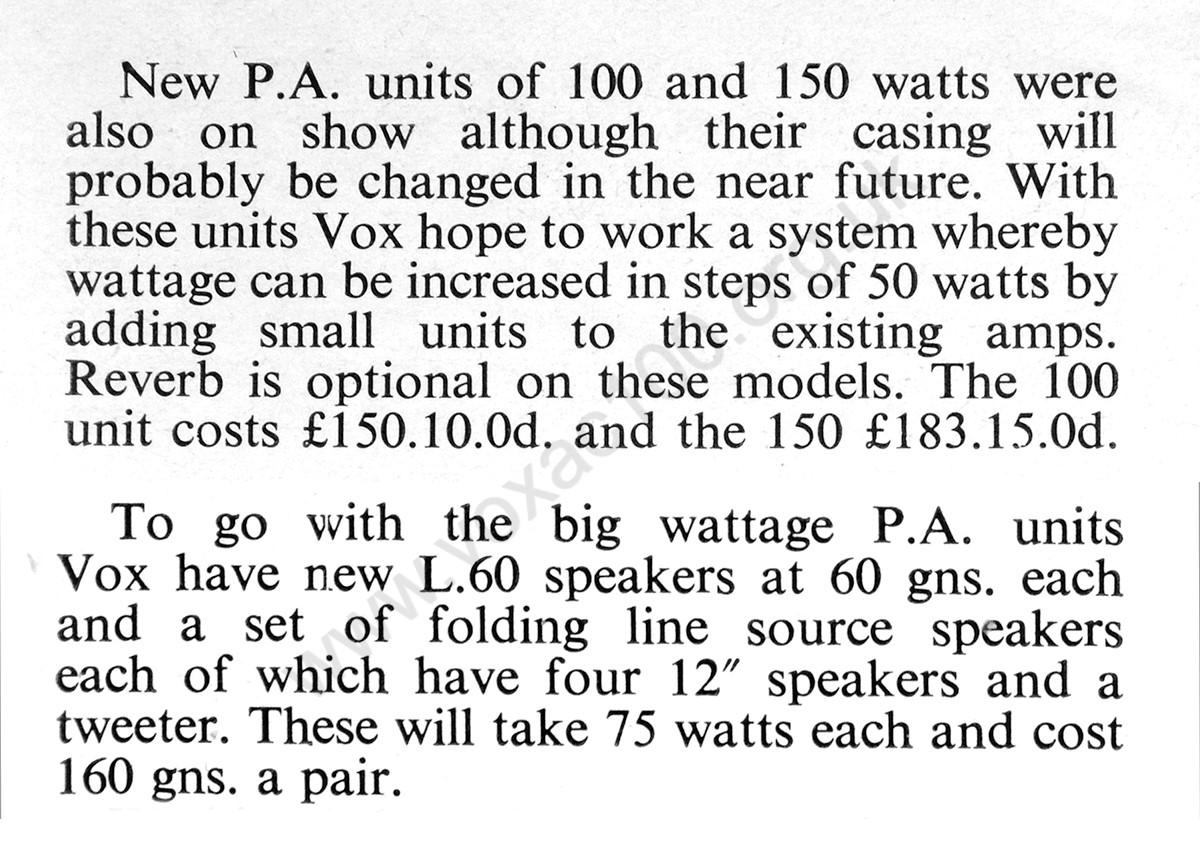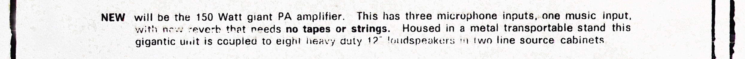 The speakers mentioned in the Trade Fair text - "eight heavy-duty 12" loudspeakers in two line source cabinets" - may have simply have been promotional talk for standard LS60 cabinets. Although these are regularly said in the literature to be 60 watt units (the clue very definitely being in the name), it is likely that they could handle 80 watts with ease - a pair for 150 or 160 watts (see the review in "Beat Instrumental" magazine further down this page). No mention is made in the pricelists of proprietary cabinets or drivers.