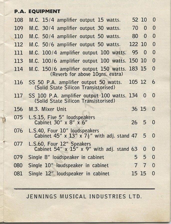 The MC150 was the largest and most powerful amplifier (of any sort) formally offered by Jennings in the 1960s. The intention initially was to offer an all-valve unit - a preamp along the lines of the MC100/4 with three microphone inputs and one for music. By the time the amp came to production in late 1965, it was evidently felt that the six-input transistor preamp, developed for the MC50/6 and MC100/6, would be better as a "front end". Reverb became an optional extra (10 guineas).