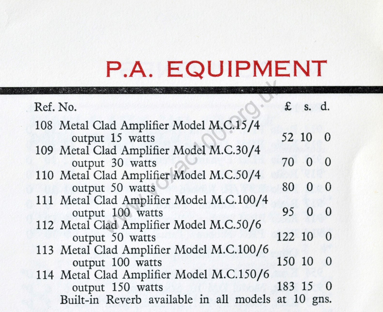 To date, no surviving example of the M.C.150 has come to light (in common with the MC30). The 1980s and 1990s were not kind to older PA equipment. For surviving MC50s from 1965 and later, see this page. MC100s can be found here.