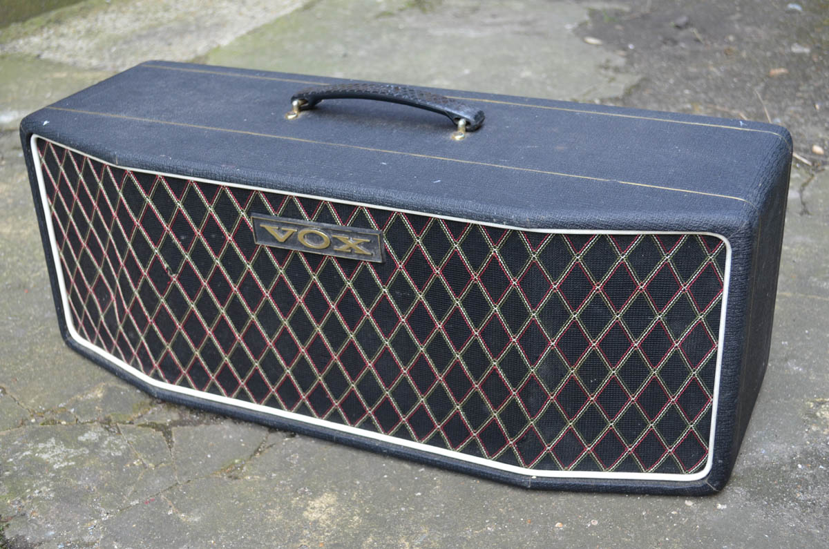 The speaker cab with the angled front may be a large Gyrotone unit. The amp (all solid state) was not put into production by Vox / JMI, but by Jennings Electronic Industries, the company set up by Tom Jennings after the demise of Vox. The legend on the strip certainly says "VOX" and perhaps "PA50" after it.
