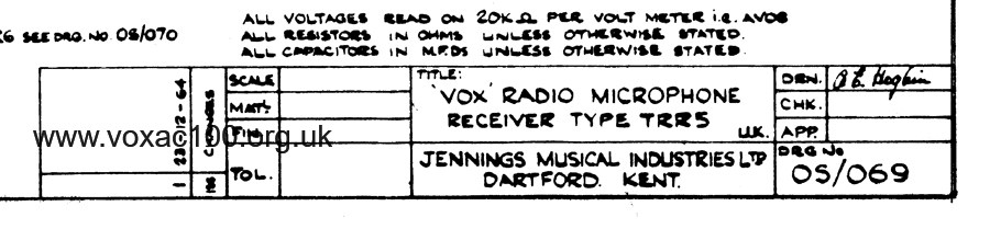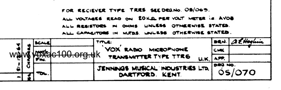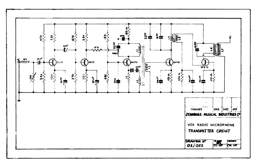 At present the only known circuit diagram for the first versions of the Vox Radio Microphones is OS/052, undated, but probably early 1964.