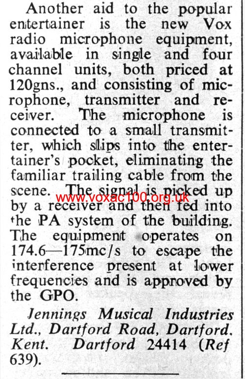 As for other excursions, Alan Harding remembers taking an early version of the JMI unit to Pinewood Studios, where a James Bond was being filmed at the time - much interest, but no orders. And he also recalled demonstrating the system in a large Catholic church in London (for the celebrant at mass). Rodney Angell, who worked as an assistant to the JMI Research and Design Department, remembered attempts to build the transmitter into guitars.
