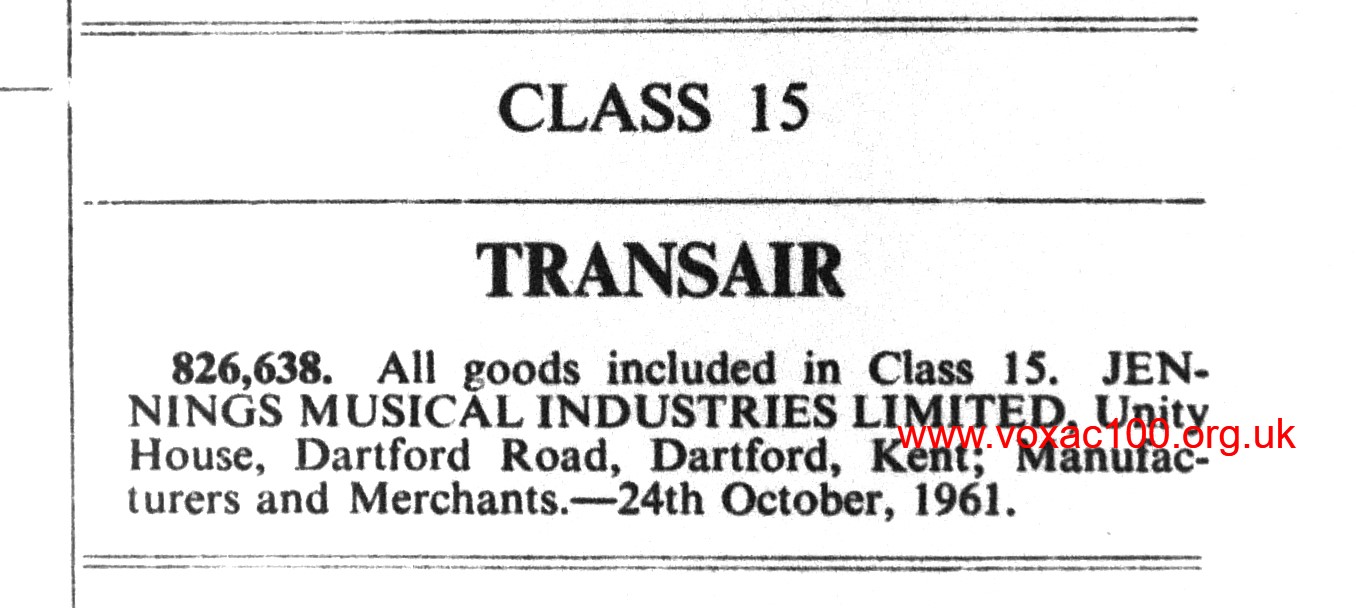 In preparation, Tom registered a trade name with the Patent Office. The Vox Radio Microphone was to have been called the Vox "Transair", though the name was evidently dropped along the way.